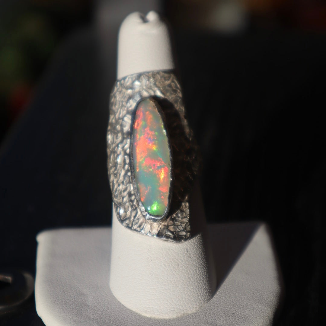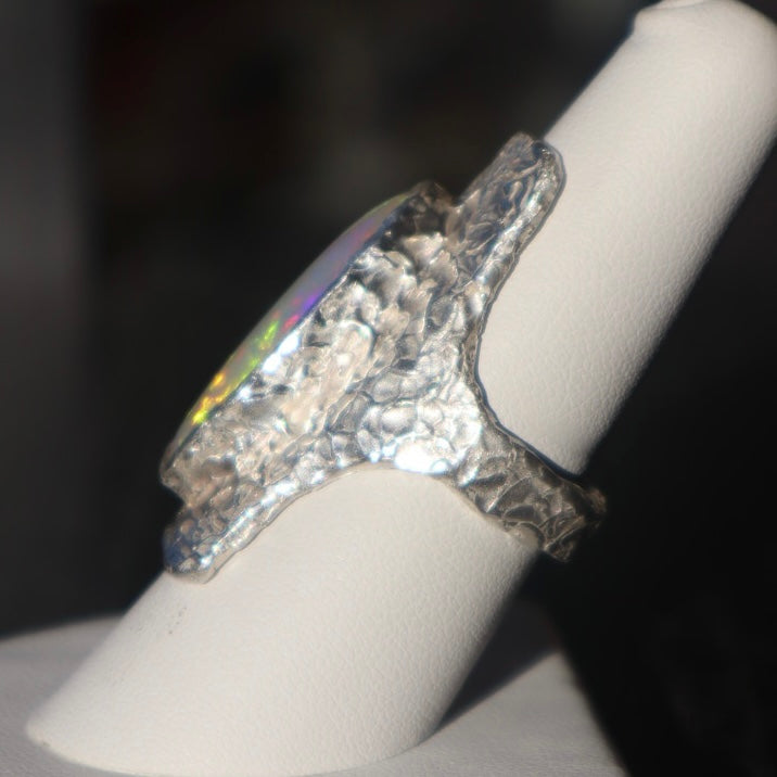 Hand-crafted fine (.999) silver ring set with a breathtaking AA quality Ethiopian Opal, accented a hammered-texture design.