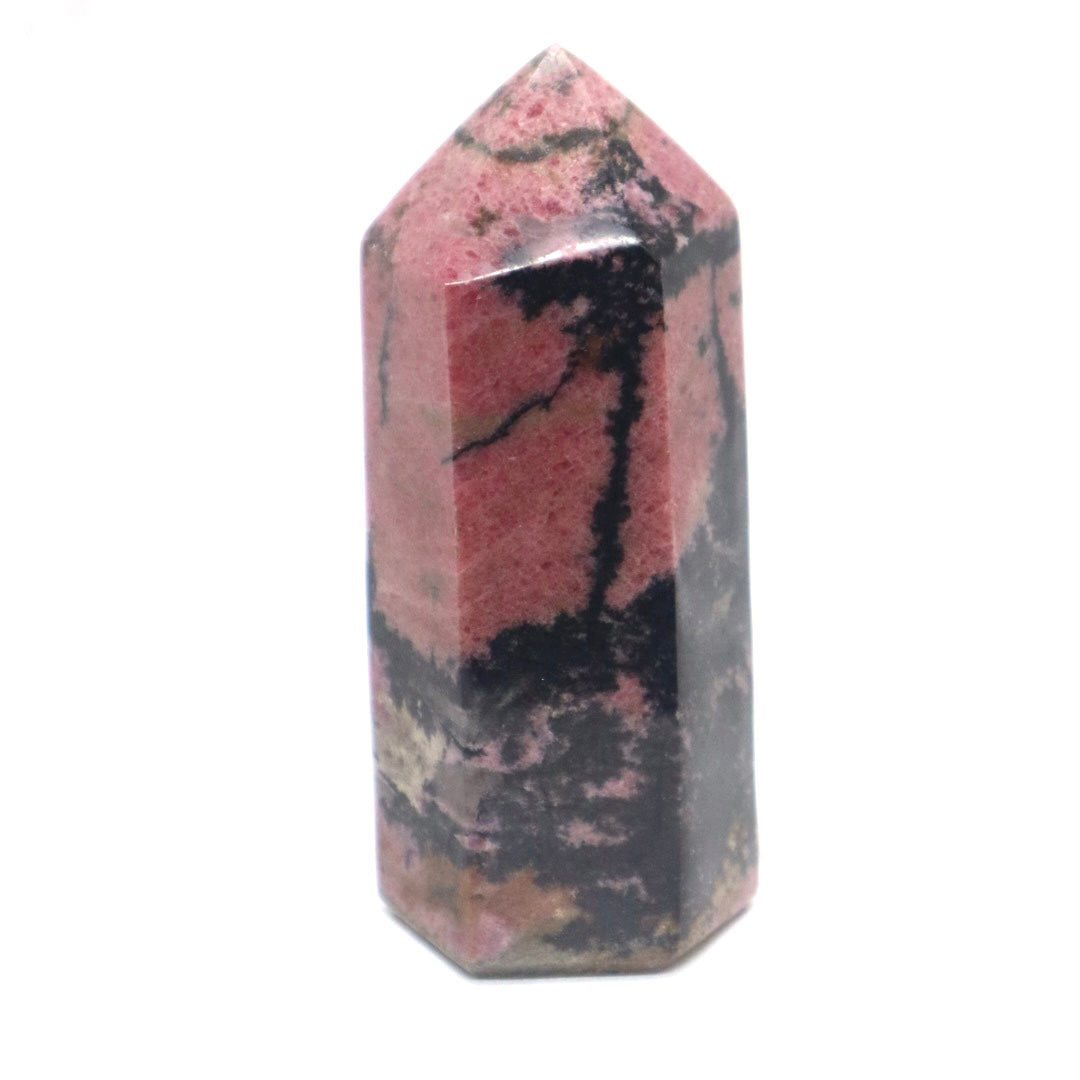 Carved & polished beautiful deep-pink rhodonite tower with a beautiful balance of black manganese throughout.