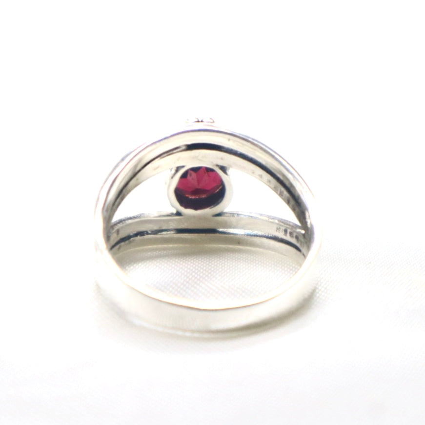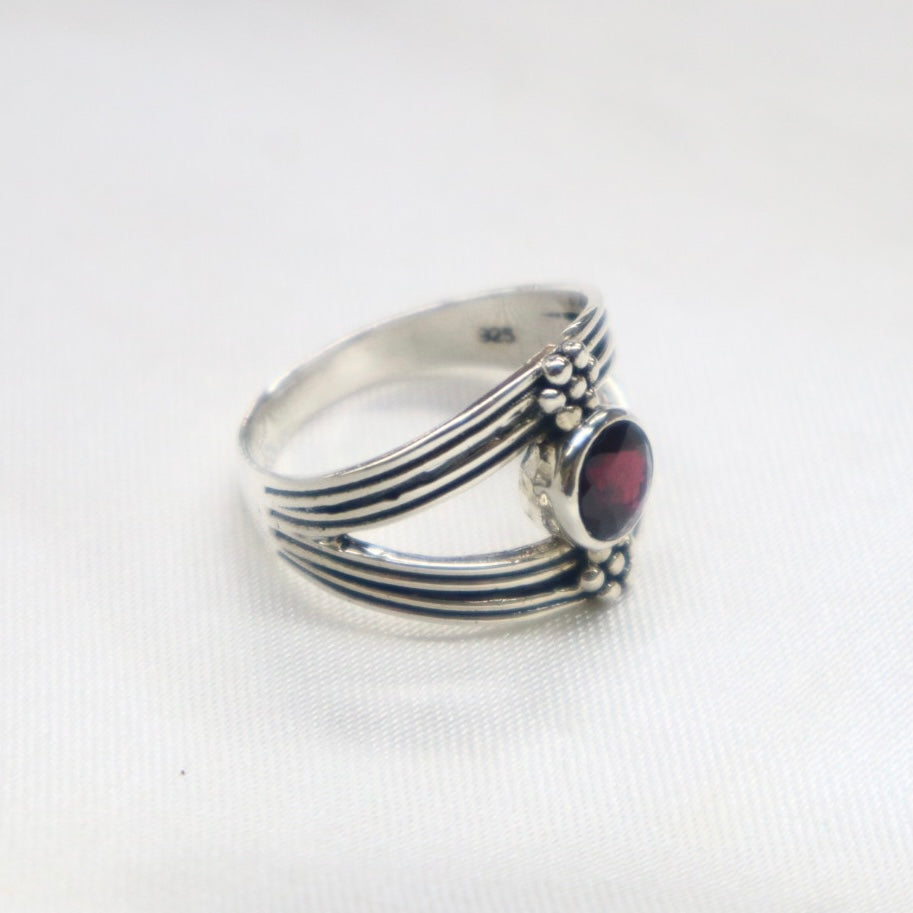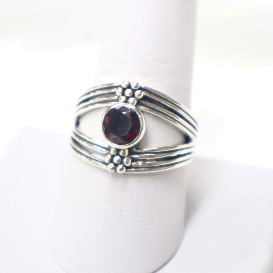 This sterling silver Bali-Style bypass design ring features a faceted round garnet accented by a flower dot-design. This piece was handmade in Tibet.