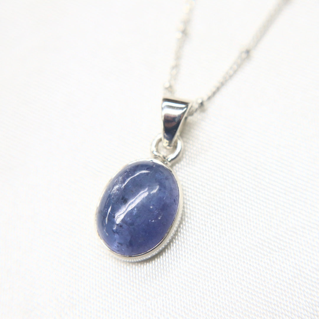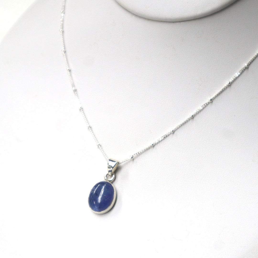 This handmade sterling silver & bezel-set tanzanite cabochon pendant sits on a sterling silver satellite chain, creating a stunning birthstone necklace!