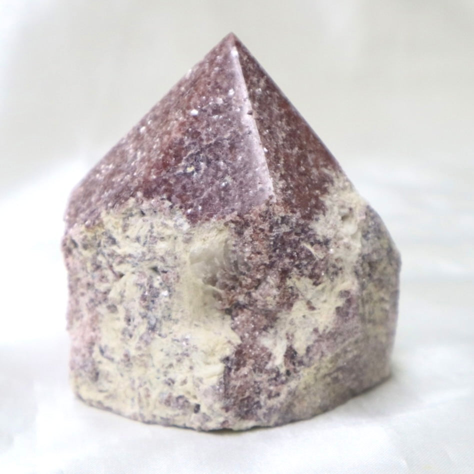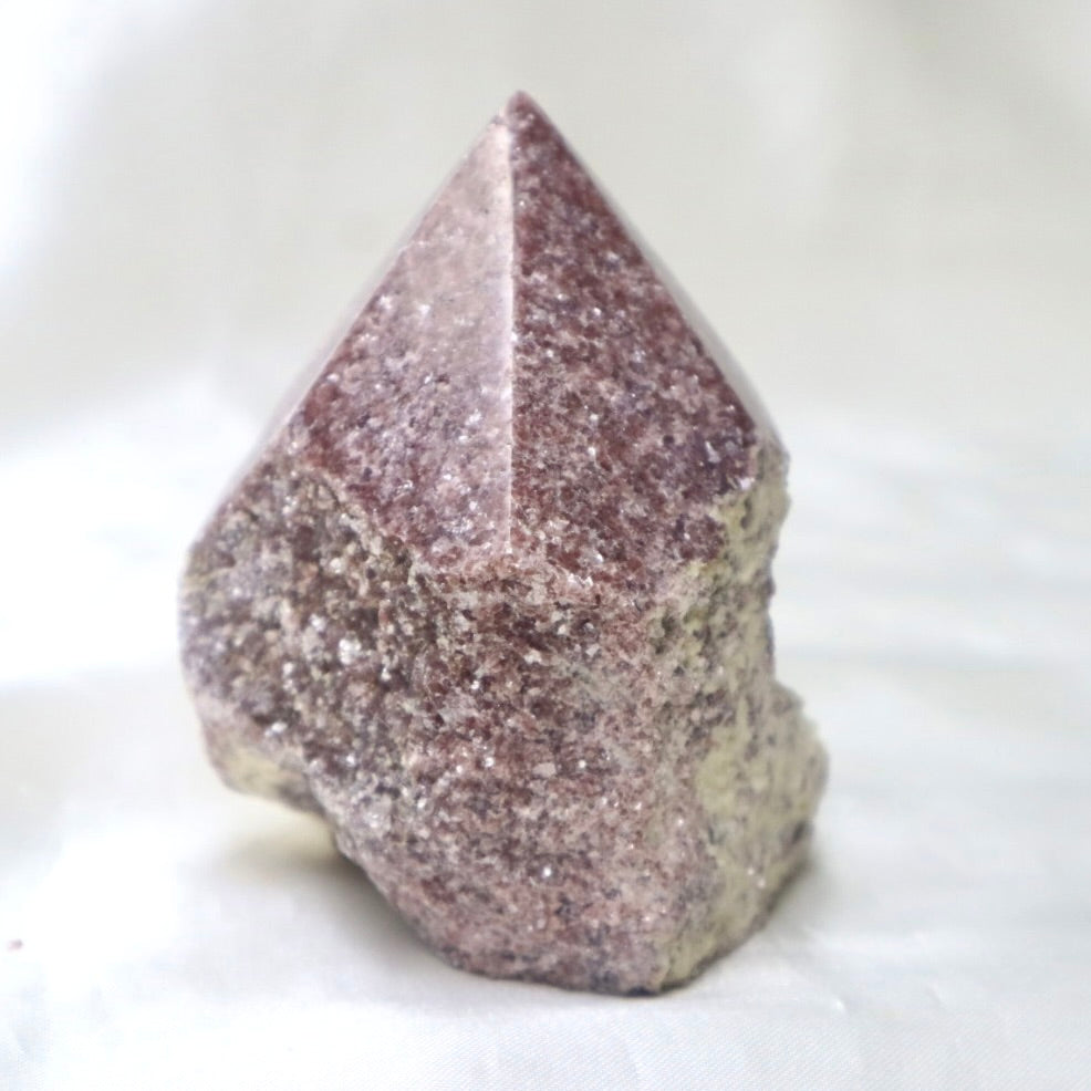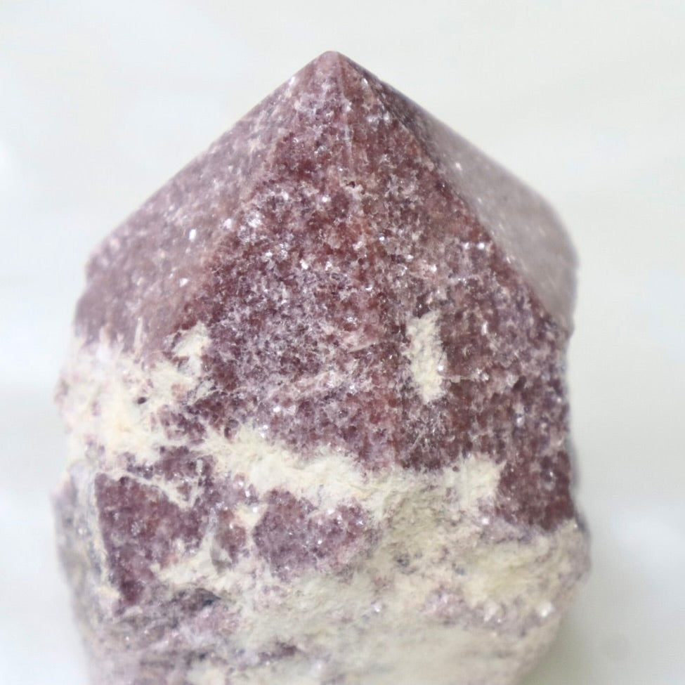 Beautiful & sparkly rough lepidolite with a polished point. Lepidolite is purple mica!
